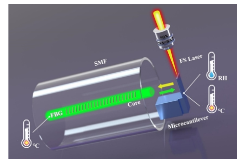 Simultaneous measurement of humidity and temperature based on fiber-tip microcantilever cascaded with fiber Bragg grating