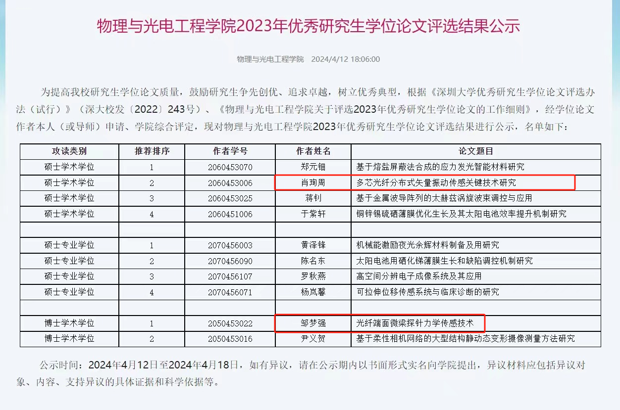 为提高深圳大学研究生学位论文质量,鼓励研究生争先创优、追求卓越,树立优秀典型,根据《深圳大学优秀研究生学位论文评选办法(试行)》(深大校发〔2022〕243号)、《物理与光电工程学院关于评选2023年优秀研究生学位论文的工作细则》,经学位论文作者本人(或导师)申请、学院综合评定,研究中心邹梦强博士的毕业论文《光纤端面微梁探针力学传感技术》和肖珣周硕士的毕业论文《多芯光纤分布式矢量振动传感关键技术研究》入选物理与光电工程学院2023年优秀研究生学位论文。热烈祝贺!