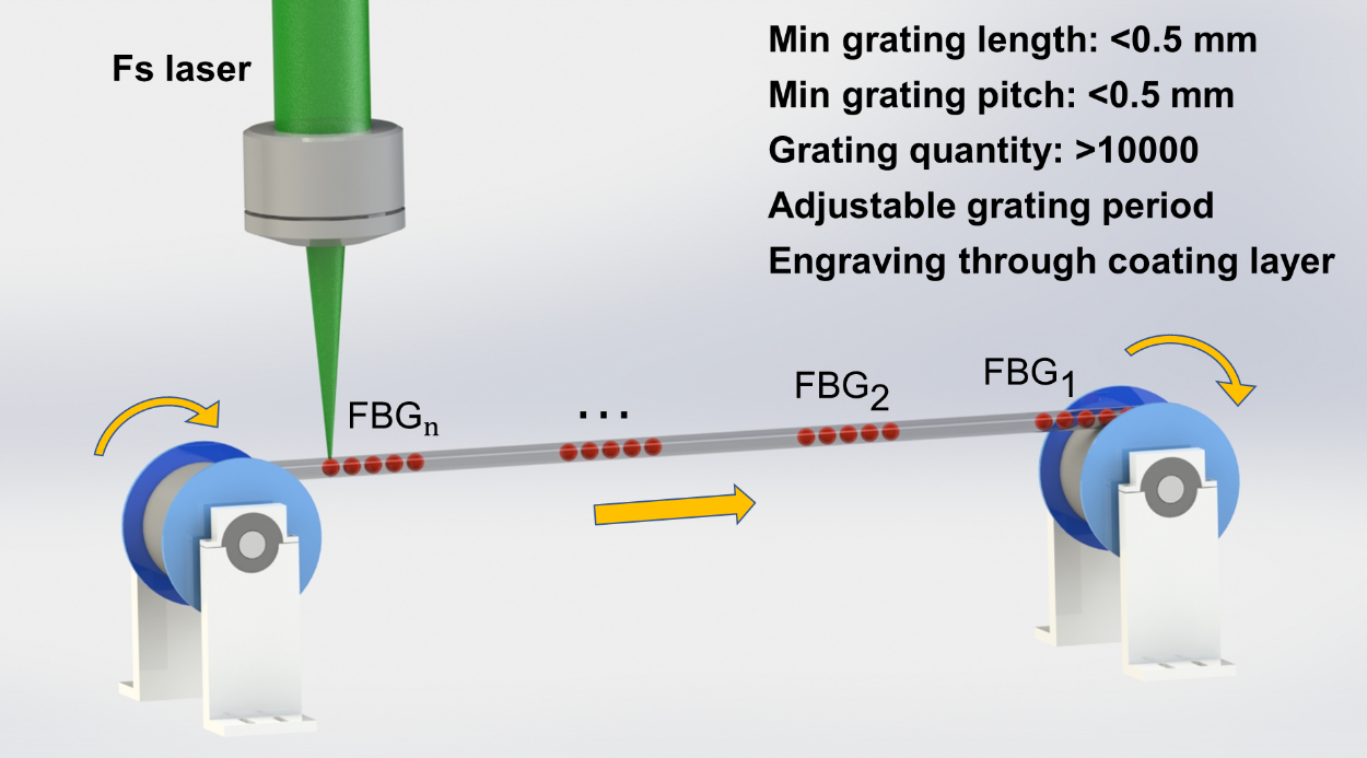 This advanced technology enables highly efficient and fully automated preparation of large-scale series/parallel integrated fiber grating (including weak reflection point) arrays at the km level in single-core and multi-core optical fibers. The advantages include direct writing through a layer of coating, no mask, no hydrogen loading, no secondary coating, and fiber spool-to-spool processing. It features fully automatic control of grating preparation processes such as fiber movement, clamping, fiber take-in, fiber take-out, fiber core alignment, laser focusing and exposure. Optical fibers containing fabricated fiber grating arrays retain the original tensile strength of the pristine fiber, and are resistant to high temperatures with excellent long-term stability.