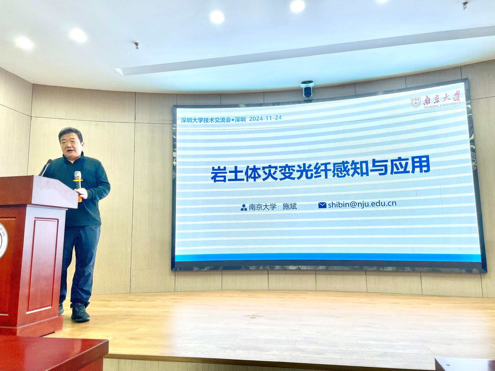 南京大学施斌教授于深圳大学粤海校区光电子学研究所301多功能厅作了题为“岩土体灾变光纤感知与应用”的学术报告。众多师生参加,现场气氛热烈、掌声不断。