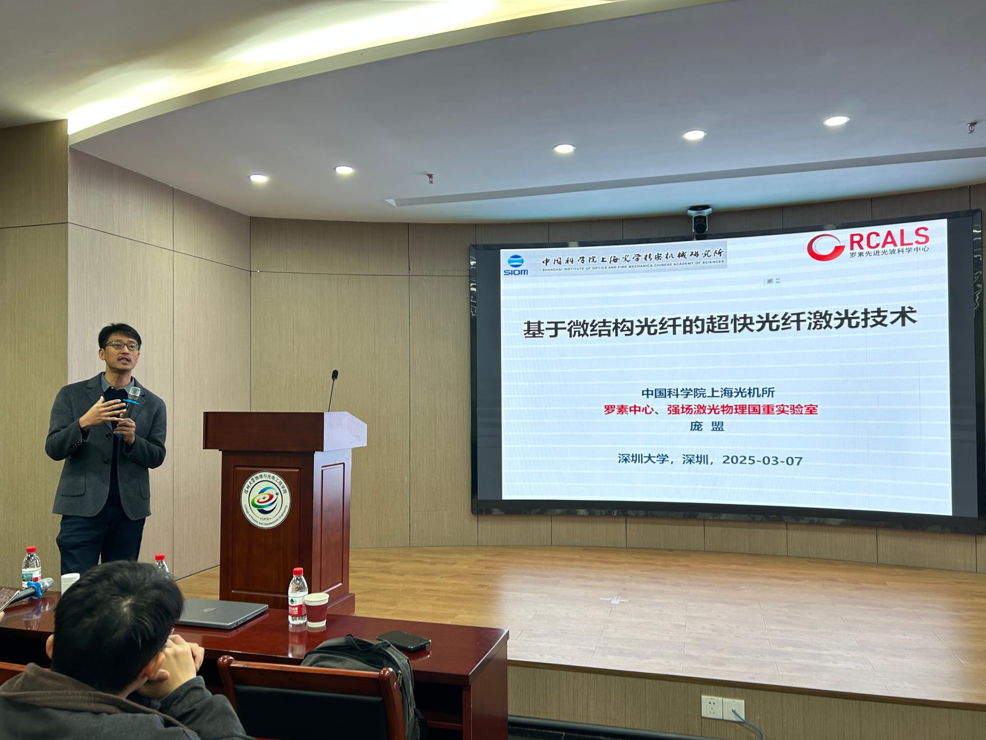 2025年3月7日上午,中国科学院上海光机所庞盟研究员应邀在深圳大学粤海校区光电子学研究所301多功能厅作了题为“基于微结构光纤的超快光纤激光技术”的学术报告。庞盟研究员在报告中系统回顾了自己的科研历程,并详细介绍了其团队在超快激光、微结构光纤设计与制备等领域的最新研究成果。报告内容深入浅出,既有理论深度,又结合实际应用,引发了与会者的广泛兴趣。