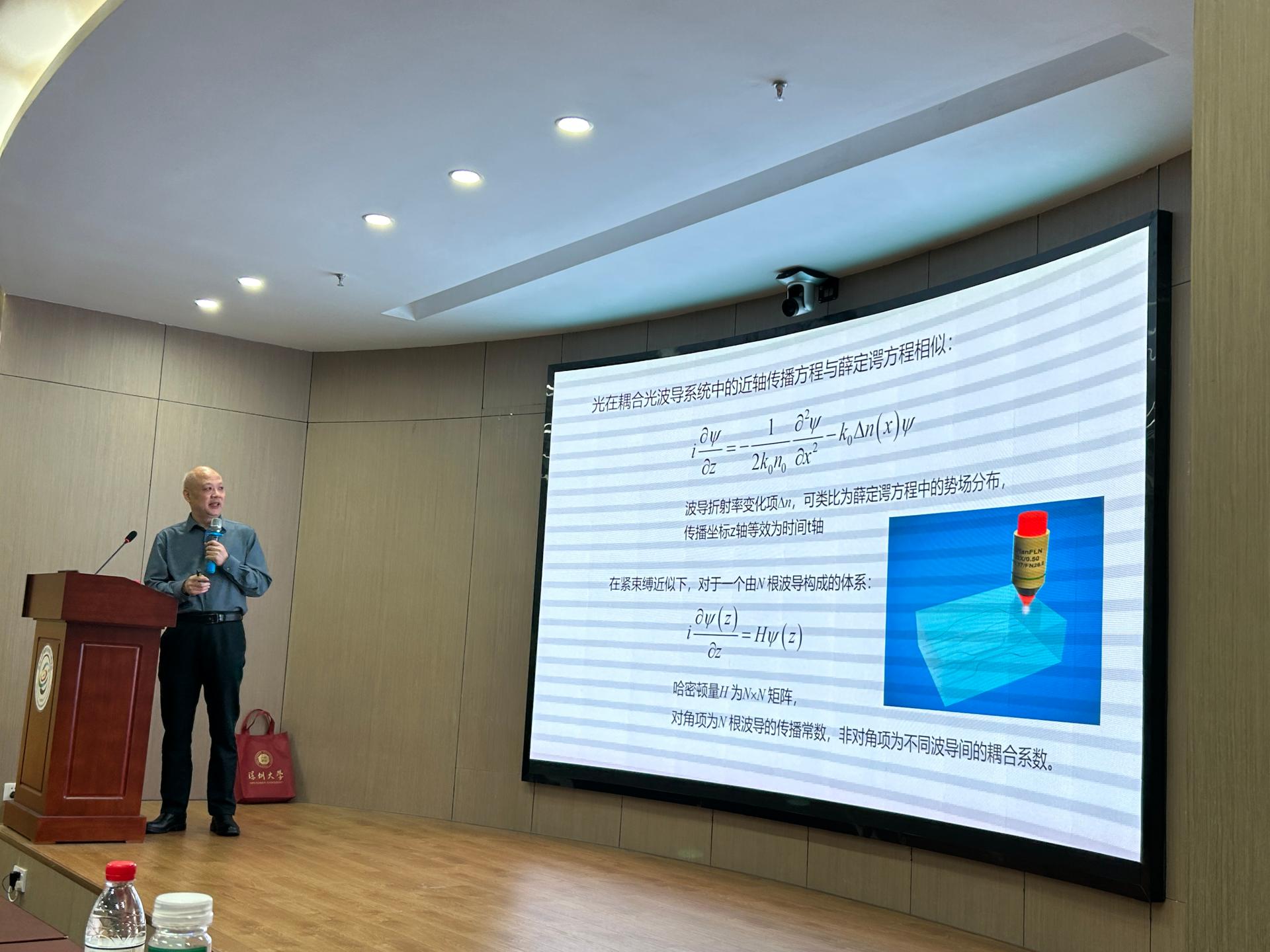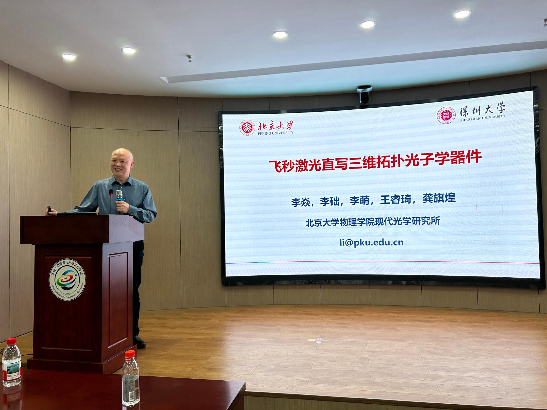 2025年3月15日,北京大学李焱教授应研究中心廖常锐教授邀请在深圳大学粤海校区光电子学研究所301多功能厅作了题为“飞秒激光直写三维拓扑光子器件”的学术报告。报告吸引学院众多师生参与,收获阵阵掌声。李焱老师是北京大学物理学院教授,政府特殊津贴专家,全国优秀科技工作者。从事飞秒激光三维微纳制造和光场调控研究,利用基于空间光调制器和超表面的焦场整形提高飞秒激光三维微纳制造性能。近期在透明材料内部制备了可重构定向耦合器、三维光量子芯片和三维拓扑光子学器件等。