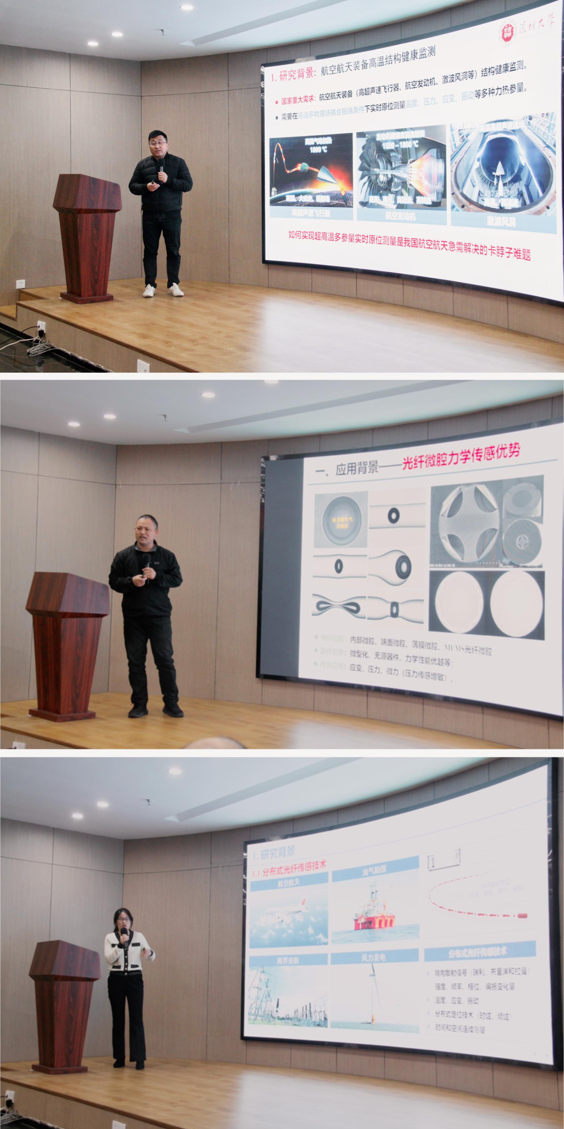 会议第三阶段由学术委员会主任清华大学孙洪波教授主持,重点实验室主任廖常锐教授首先做主任报告,汇报了重点实验室的研究方向、人才队伍、平台建设、科研成果和发展规划情况。随后,何俊教授做题为“飞秒激光直写蓝宝石光纤光栅及高温多物理场传感应用”学术报告;刘申副教授做题为“光纤微腔力学传感及应用”学术报告;付彩玲助理教授做题为“OFDR分布式光纤传感技术及应用”学术报告。