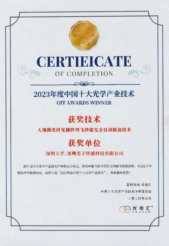 5月18日举行的2023年度中国十大光学产业技术颁奖典礼暨产业创新大会上,深圳大学王义平教授团队和深圳光子传感科技有限公司联合研发的“大规模光纤光栅阵列飞秒激光全自动制备技术”从101个申报项目中脱颖而出,荣膺2023年度中国十大光学产业技术奖。