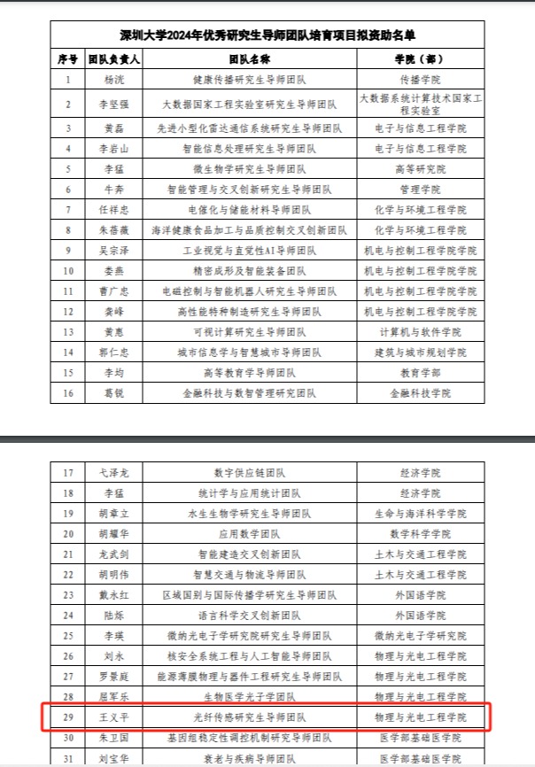 经团队负责人申报、培养单位初审、研究生院组织专家评审推荐等环节,日前,深圳大学公示了2024年优秀研究生导师团队培育项目拟资助项目,研究中心王义平教授带领的光纤传感研究生导师团队榜上有名。感谢深圳大学和物理与光电工程学院的肯定和支持,研究中心全体成员将继续锐意进取,为我国科研事业添砖加瓦!