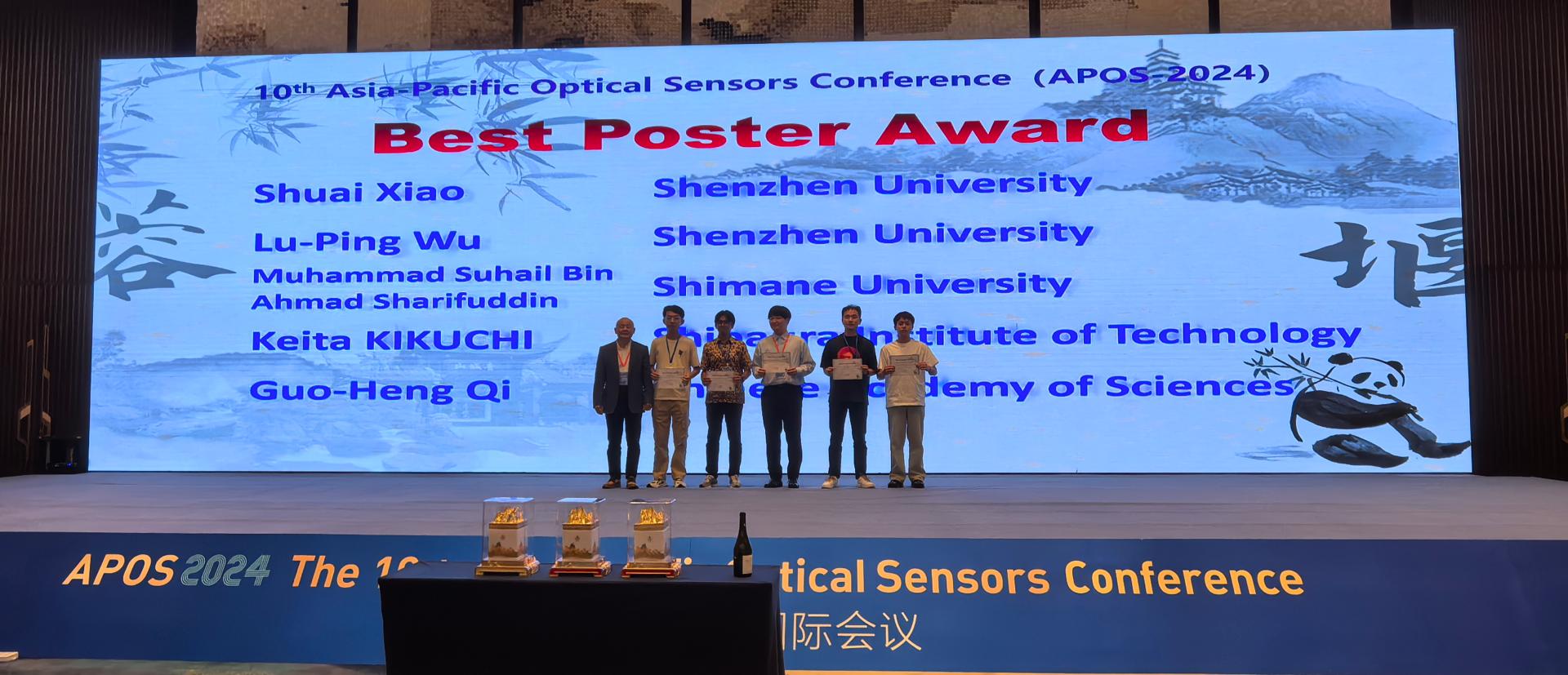 在会议的海报展示环节中,研究中心的吴璐平和肖帅同学表现优异,从众多参展海报中脱颖而出,获得了最佳海报奖。他们的研究分别涉及光纤三维形状传感和单光纤涡旋光镊,充分展现了研究中心在多领域内的创新性研究成果。评审专家一致认为,两位同学的海报在内容、设计和表达上均达到较高的水平,展示了深厚的科研功底和严谨的学术态度。