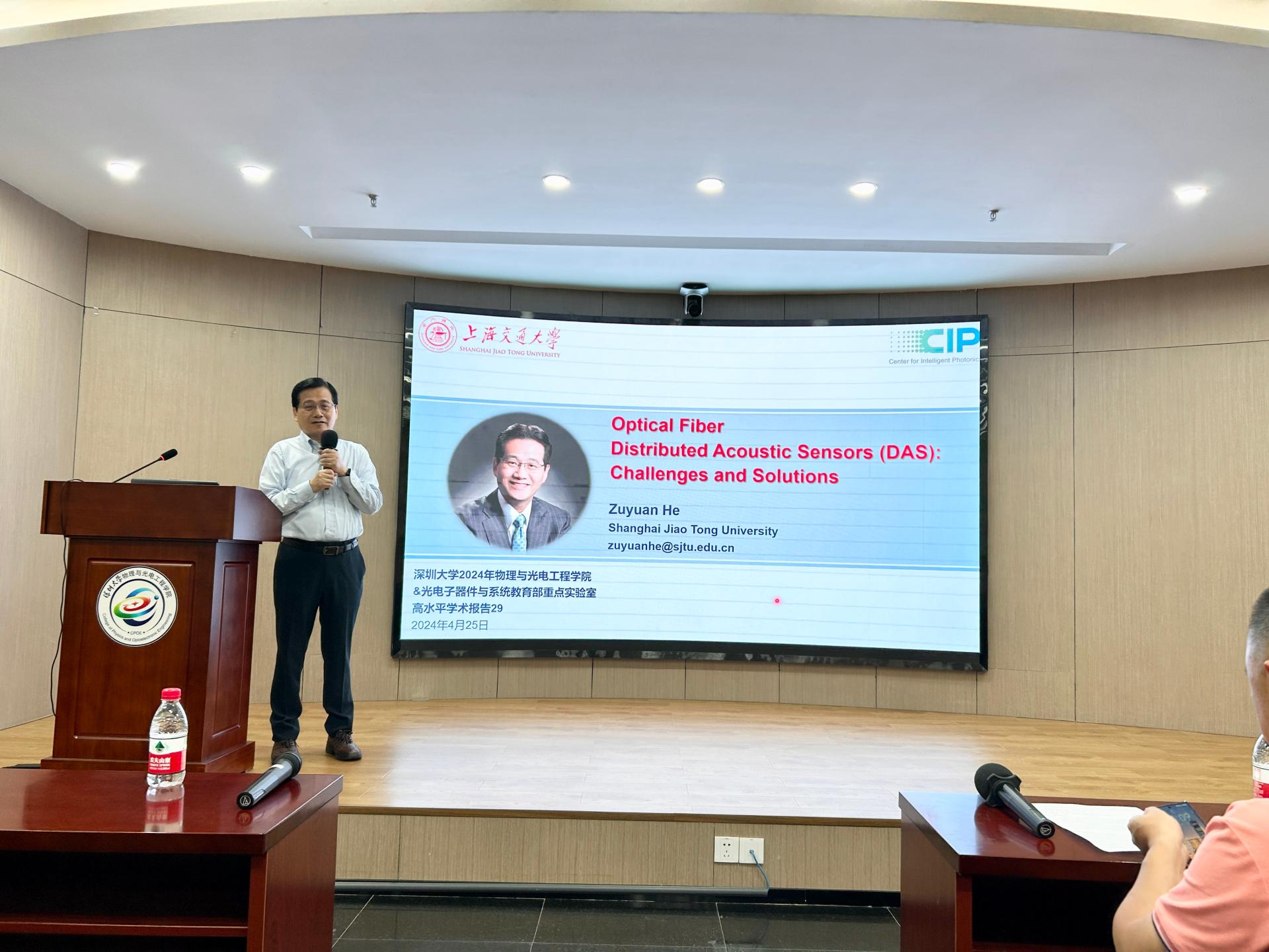 2024年4月25日上午,上海交通大学何祖源教授应研究中心王义平教授邀请莅临深圳大学粤海校区广东省光纤传感技术粤港联合研究中心参观指导。何祖源教授于光电子研究所301多功能厅作了题为“光纤分布式声波传感器:挑战与突破”的学术报告,吸引众多师生参加。