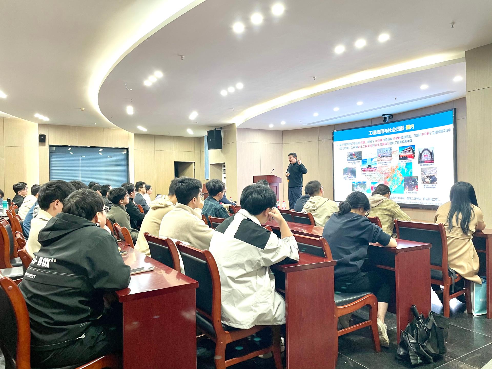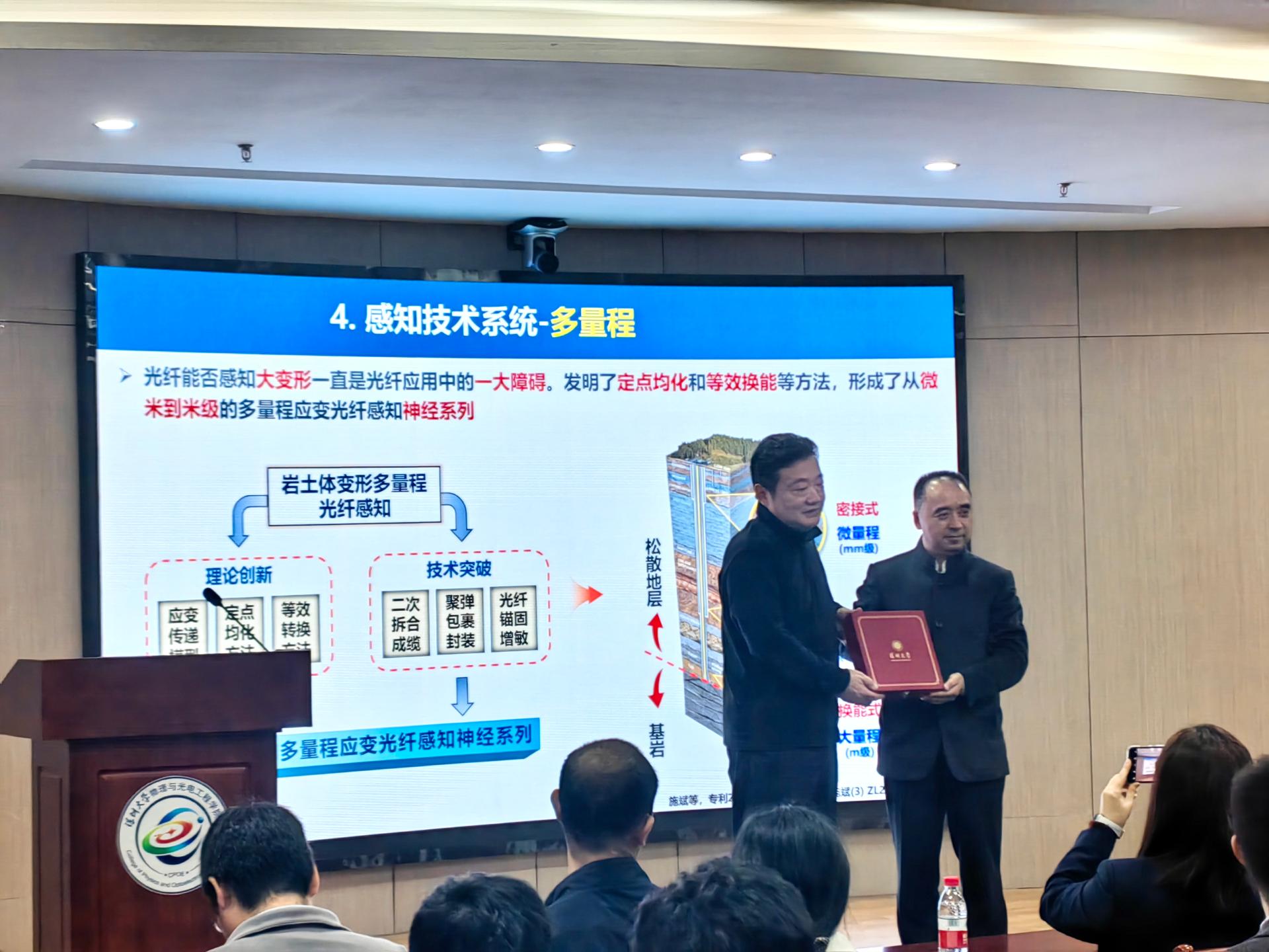 南京大学施斌教授于深圳大学粤海校区光电子学研究所301多功能厅作了题为“岩土体灾变光纤感知与应用”的学术报告。众多师生参加,现场气氛热烈、掌声不断。