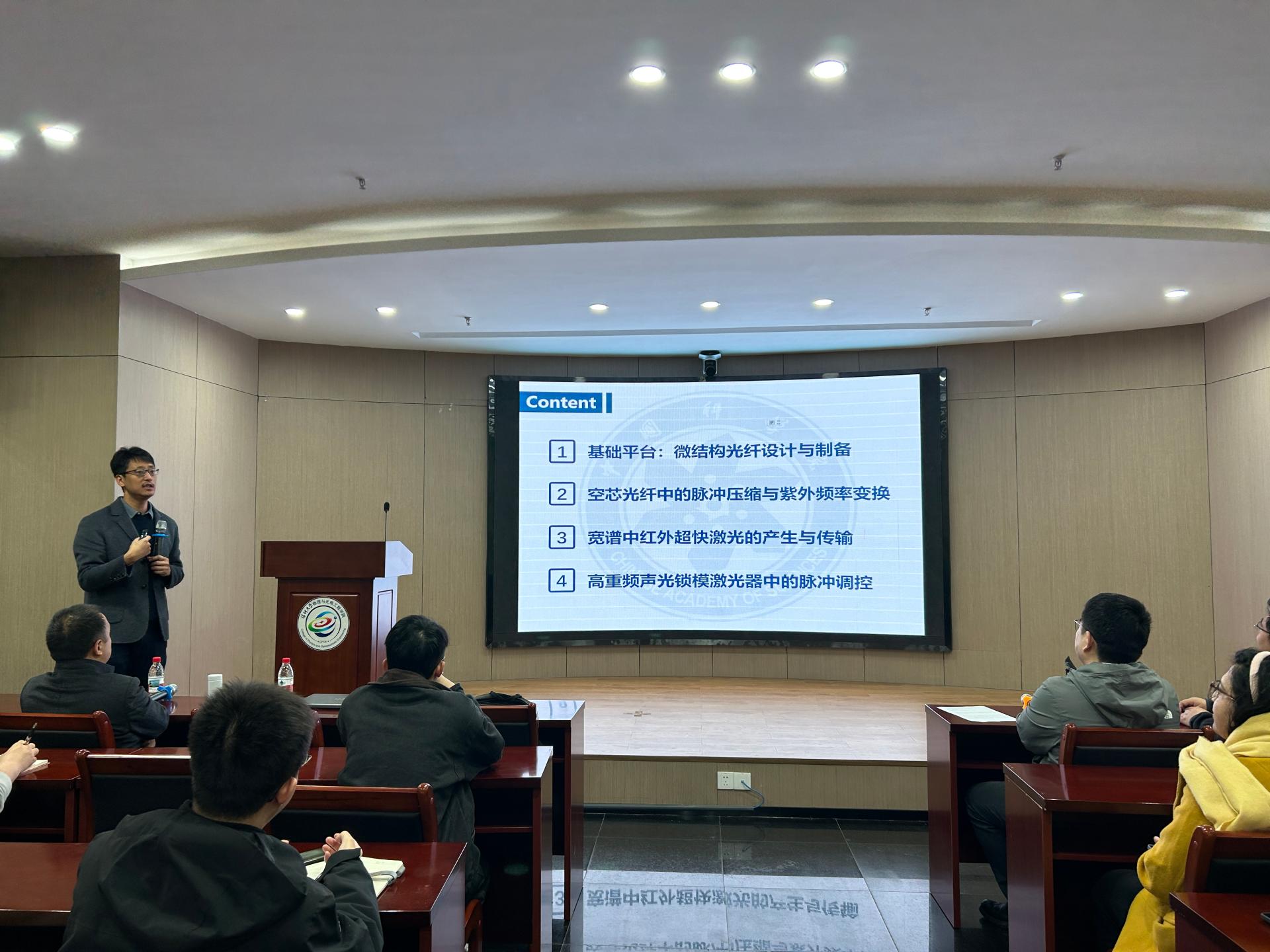 2025年3月7日上午,中国科学院上海光机所庞盟研究员应邀在深圳大学粤海校区光电子学研究所301多功能厅作了题为“基于微结构光纤的超快光纤激光技术”的学术报告。庞盟研究员在报告中系统回顾了自己的科研历程,并详细介绍了其团队在超快激光、微结构光纤设计与制备等领域的最新研究成果。报告内容深入浅出,既有理论深度,又结合实际应用,引发了与会者的广泛兴趣。