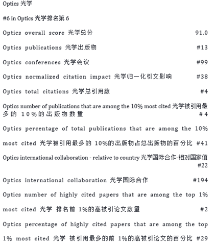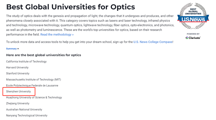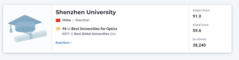 根据《美国新闻与世界报道》(US News & World Report)(简称US News)最新发布的“全球最佳光学大学”排名,深圳大学光学排名世界第六、国内第一,在光学总引用、光学国际合作、光学高被引论文等方面表现突出,学科建设取得显著成效,国际学术生产力和影响力再度提升。