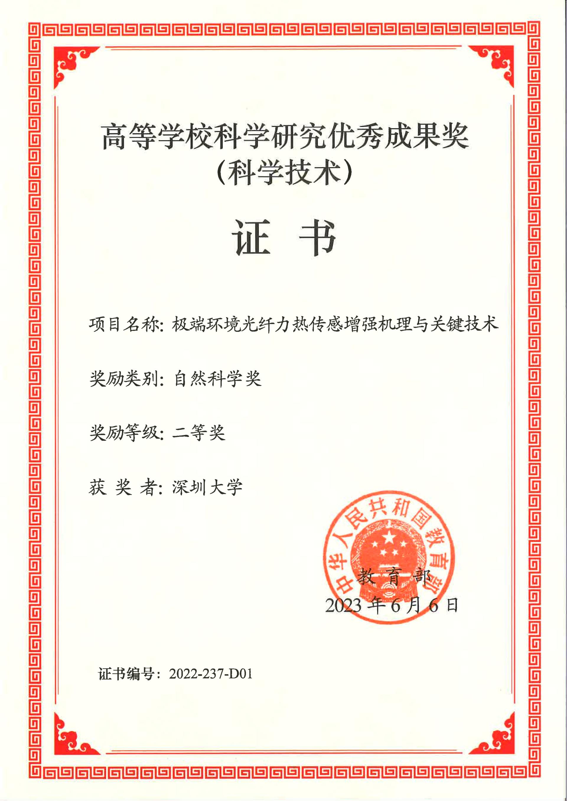 项目简介:本项目研究了光纤微结构器件的制备方法及传感机理,研究内容包括:(1)长周期光纤光栅的CO2激光制备方法及传感机理;(2)光纤布拉格光栅的超快激光制备方法及传感机理;(3)光纤微结构干涉仪的制备方法及传感机理。研究成果达到国际领先水平,成功制备世界上第一支空气芯光子带隙光纤光栅,领先国外同行三年;突破了无光敏性光纤上制备光纤布拉格光栅的难题,成功制备世界上第一支微纳光纤布拉格光栅;揭示了光纤微腔干涉仪的导模与被测量之间的高效耦合机理。项目负责人王义平是深圳大学特聘教授、国家杰青、万人领军人才。本项目增强了我国在国际光电子学领域特别是光纤传感领域的领先地位,促进了深圳市物联网光纤传感产业的快速健康发展。